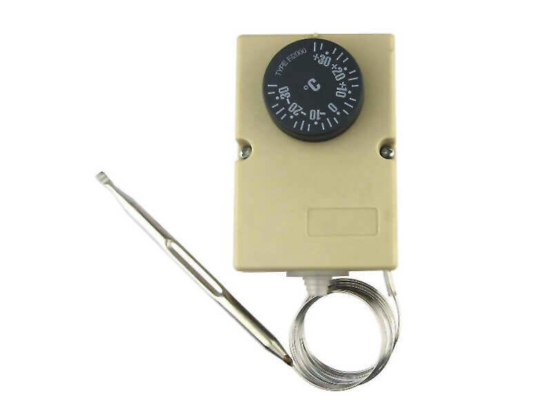 Mechanical thermostat with range of -30C to +30C. Hysteresis 2C. Max. contact load 16A. Capillary length of 1.5 m