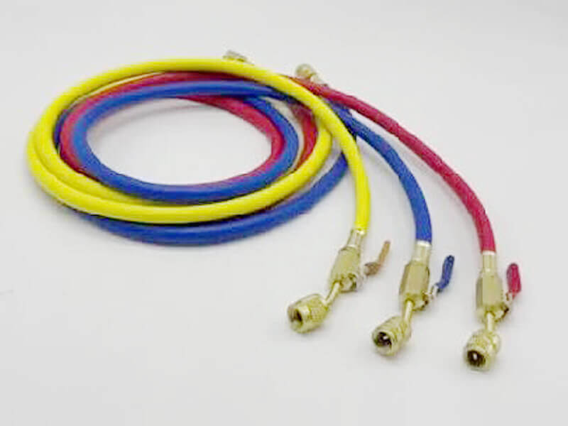 Refrigerant charging hose with compact ball valve designed to meet 1/4″ SAE requirement for refrigerant permutation, fit most refrigerants like R134A, R22, R12, R502, and R404. Standard 1/4 inch female flare fittings with a valve core depressor and 45°bend on one end for convenient access to the system. Refrigerant anti blowback fittings refrigeration charging hoses valve discharge conditioning refrigerant charging refrigerant discharge-recharge yellow jacket inter-dynamics conditioning recharge bundle refrigerant liquid hose